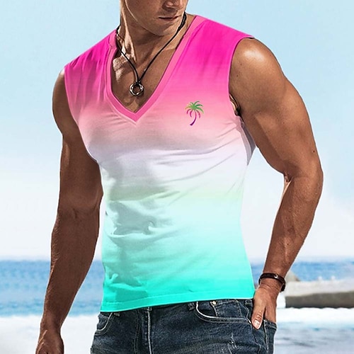 Herren Ombre Kokospalme T Shirt Ärmellos T-Shirt 3D-Druck V Ausschnitt Hemd Tropisch Outdoor Urlaub Hawaiianisch Blau Rote Purpur Sommer Frühling Bekleidung S M L XL XXL XXXL