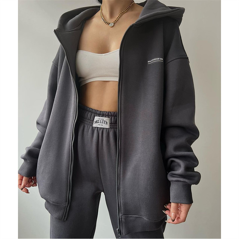 Women's Tracksuit Sweatpants Hooded Jacket Baggy Zipper Pocket Solid Colored Clothing Suit Fall Black Dark Gray Gym Workout Sports Windproof Long Sleeve Sport Activewear Micro-elastic Regular Fit
