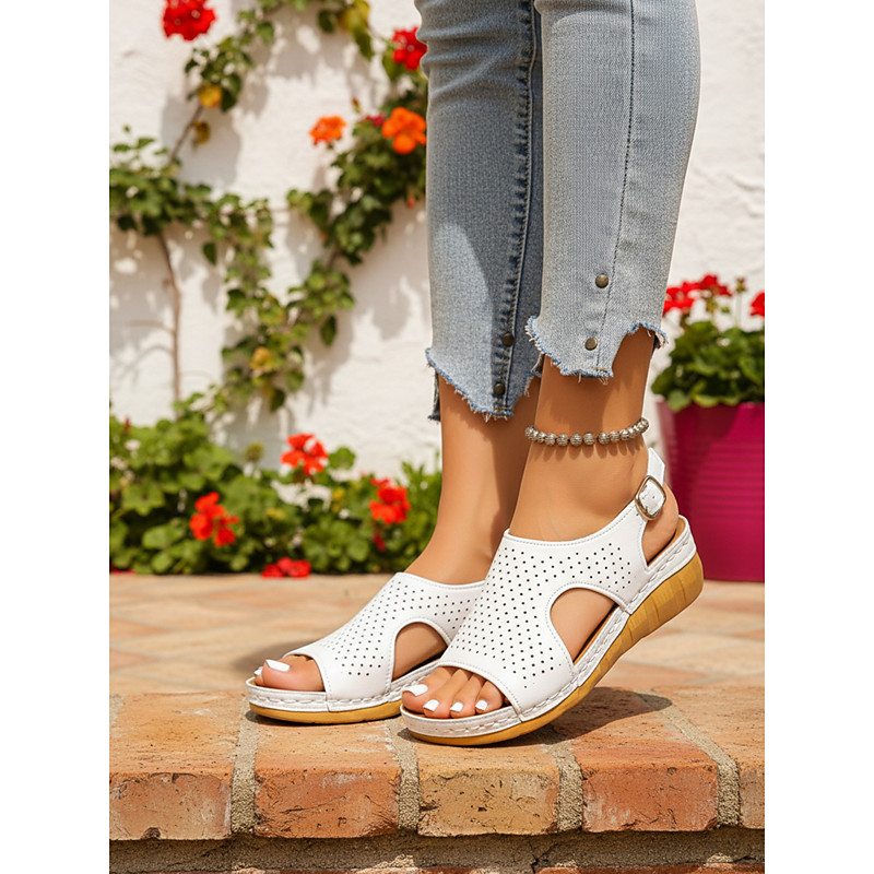 Women's Beige Closed-Toe Wedge Sandals with Adjustable Buckle – Comfortable and Stylish Shoes for Summer Walks and Casual Outing