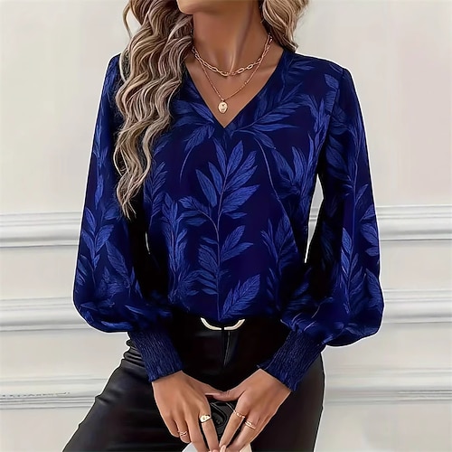 Per donna Blusa Top Eleganti Foglia Semplice Elegante Vintage Signore Manica Lunga Manica a Palloncino Scollo a V Top Regolari Quotidiano Lavoro Ferie Arricciato Patchwork Stampato Blu Vino Viola