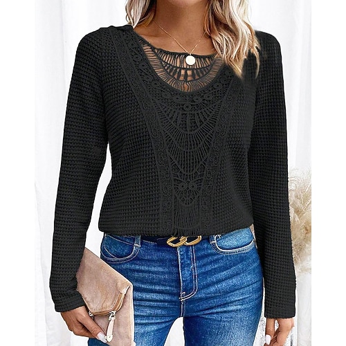 Per donna Blusa Semplice Vintage Elegante Manica Lunga Girocollo Top Regolari Quotidiano Ferie Uscire Pizzo Patchwork Nero Bianco Rosa Vino Blu marino Primavera Autunno