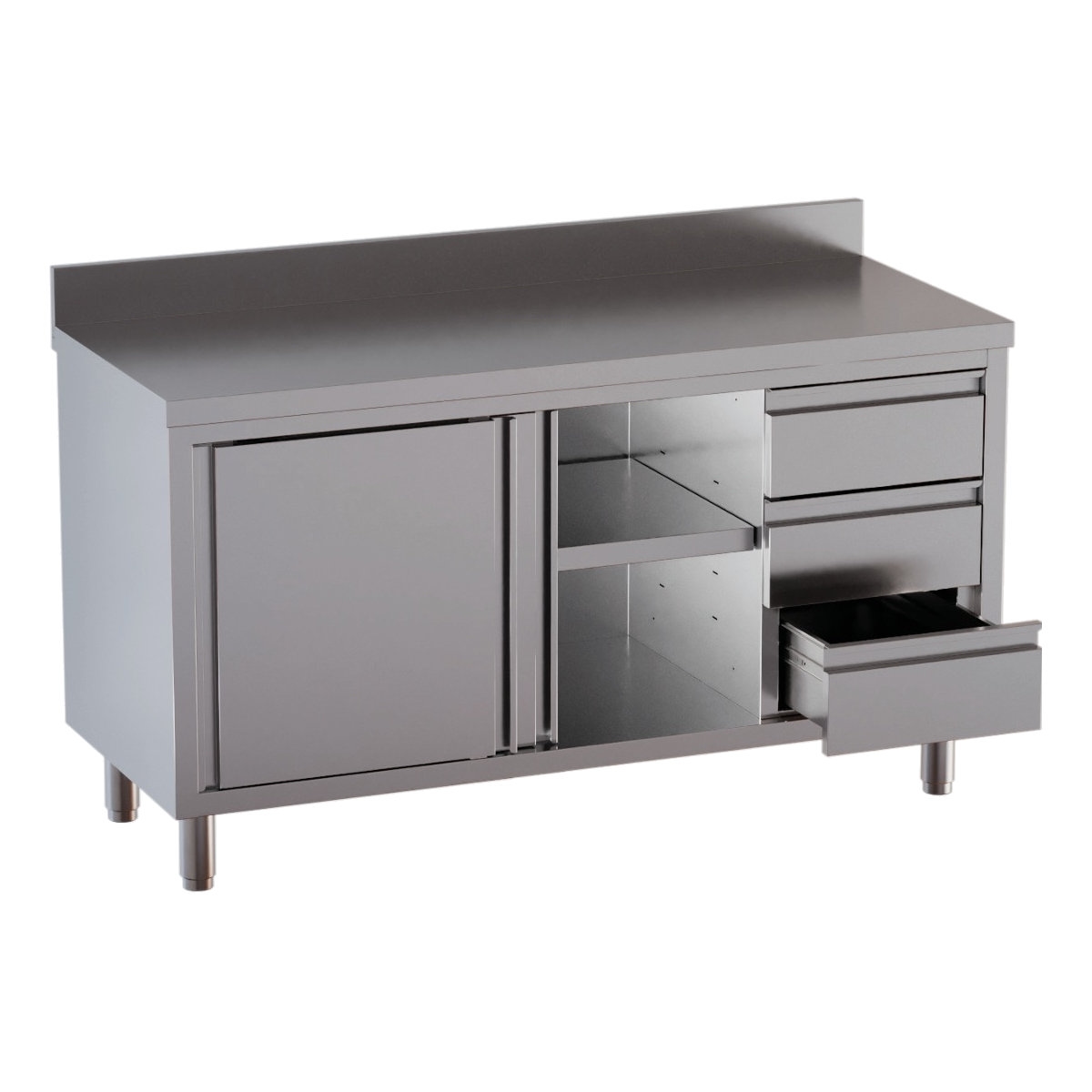 vaiotec TOPLINE Arbeitsschrank / 2 Schiebetüren, 3 Schubladen rechts & Aufkantung, 1600 x 700 mm