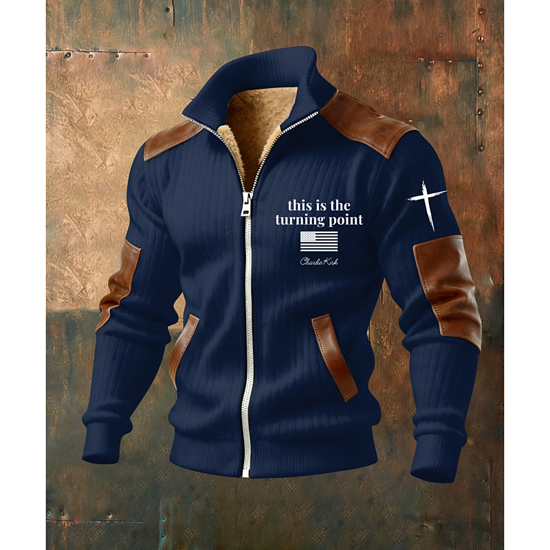 Men's Full Zip Hoodie Fleece Jacket Fleece Hoodie Black White Army Green Navy Blue Brown Standing Collar Cross American Flag Pocket Faux Leather Accents Sports Outdoor Casual Daily Polyester