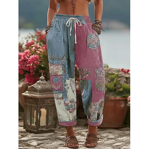 Per donna Pantaloni ispirati al lino Gamba larga Pantaloni Stile Etnico Casual Boho Lunghezza intera Vita Alta Floreale Tasca Elastico in vita Stampa Traspirabilità Morbido Micro-elastico All'aperto