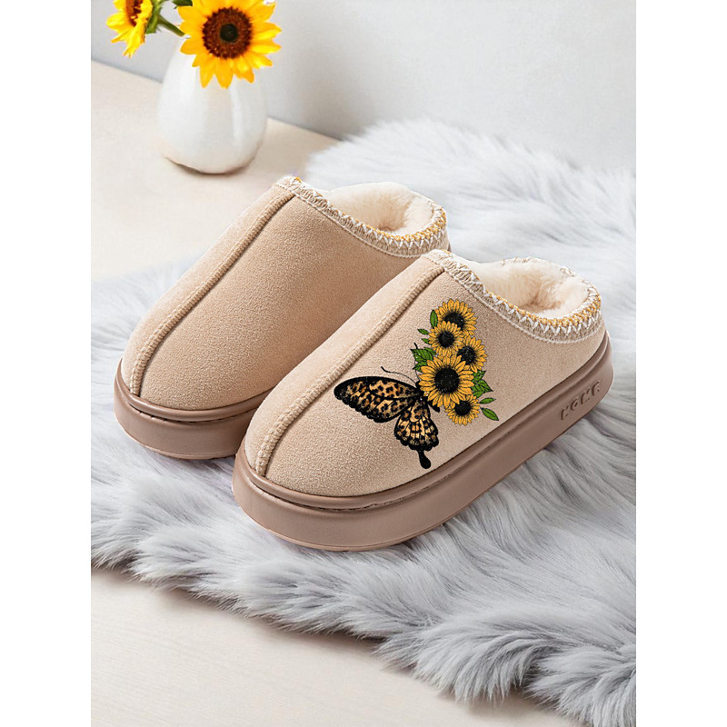 Women's Sunflower Printed Slippers - Fleece Lined Warm Indoor Shoes with Butterfly Design, Cozy Home Footwear for Winter Gifts