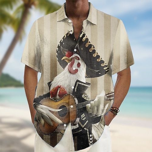 Herren Hahn Lustig Gitarrist Hemd Knopfhemd Kurzarm Vintage-Retro Outdoor Ferien Sommer Frühling Umlegekragen 3D-Druck Hemden mit Kragen Blau Khaki