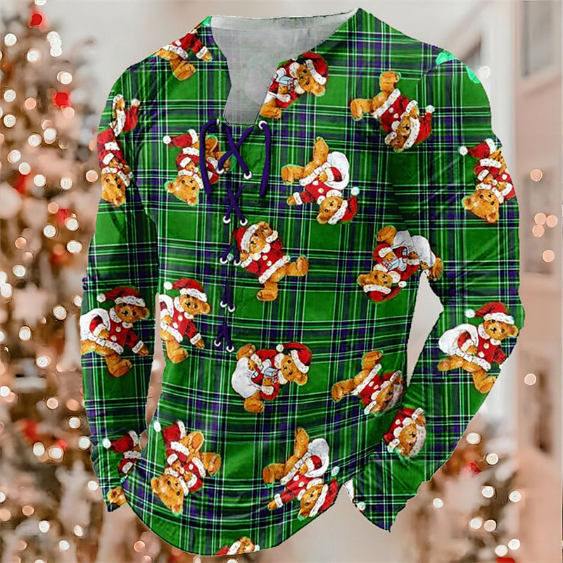 Christmas Teddy Bear Sweater Mens Graphic Shirt Tee Character Collar Sea Blue Green Black Red 3D Print Outdoor Long Sleeve Lace Up Bears Plaid Cotton