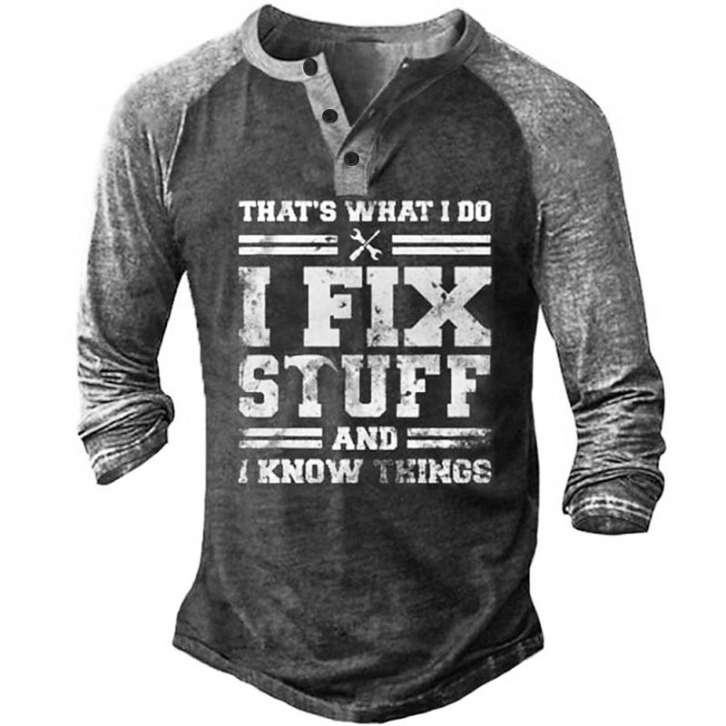 Mens Graphic Long Sleeve Henley Shirt: 'I Fix Stuff And I Know Things' - Raglan Design for Hobbies DIY Enthusiasts