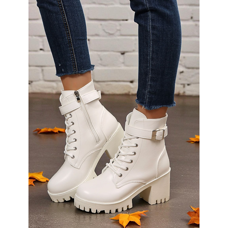 Women's White Chunky Heeled Lace-Up Boots, Stylish High Heel Combat Boots with Adjustable Buckle, Fashionable Footwear for Casual and Outdoor Occasions