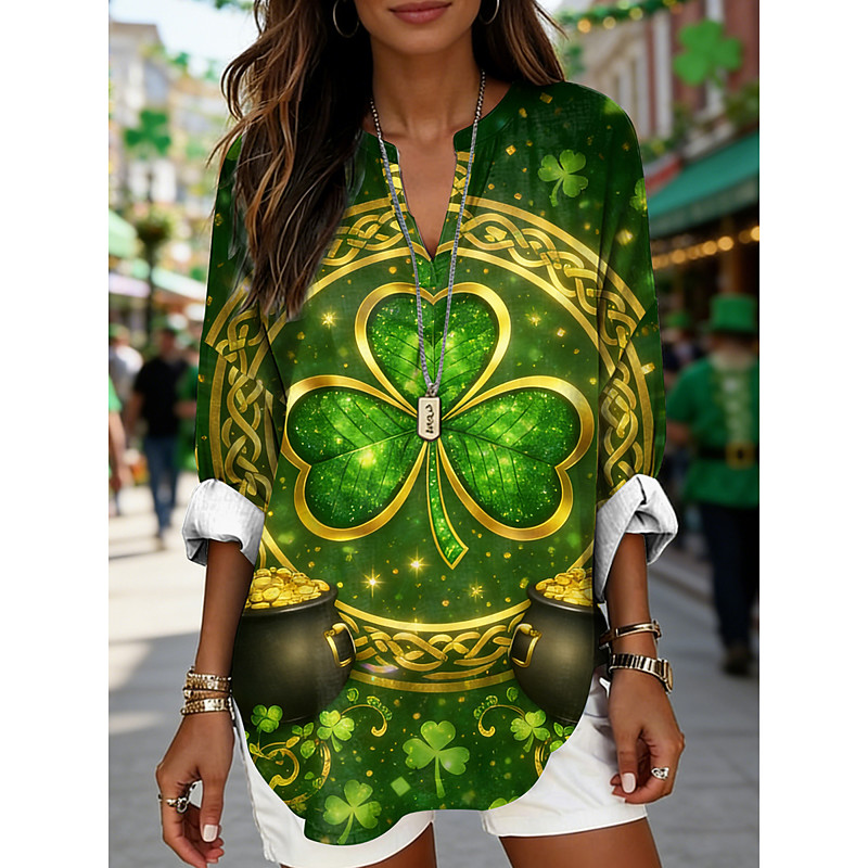 St. Patrick's Day Women's Tunic Blouse Graphic Shamrock Vintage Daily Stylish Long Sleeve V Neck Long Tops Daily Holiday Print Yellow Light Green Green Summer Spring