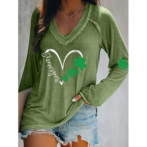 T-Shirt da donna di San Patrizio Shamrock Stilosa Classica Casuale Maniche Lunghe Collo a V Top Regolari Stampa Quotidiana Nero Verde Grigio Estate Primavera