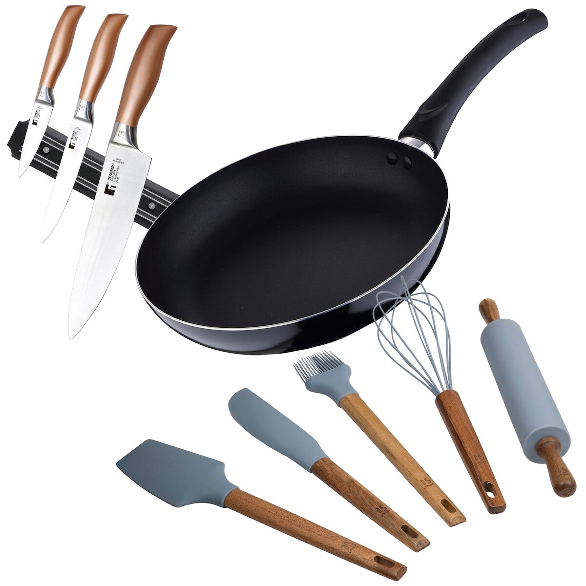 Chef sauce PIXEL - Ø24x4,5cm Bratpfanne aus gepresstem Aluminium mit 3 Edelstahlmessern und 5 Küchenutensilien aus Silikon