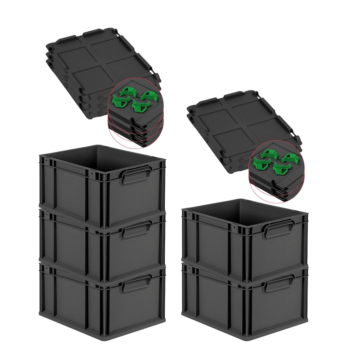 PROREGAL SparSet 5x Eurobox NextGen Grip mit Auflagedeckel & 4 grünen Verschlüssen, HxBxT 22x30x40cm, 20L, Schwarz, Griffe zu, Eurobehälter