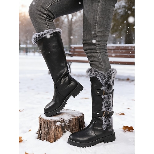 Burgunderrote, kniehohe Winterstiefel für Damen mit schwarzem Kunstpelzbesatz – lässige, lange Reitstiefel für Weihnachten, Schneetage und festliche Outfits