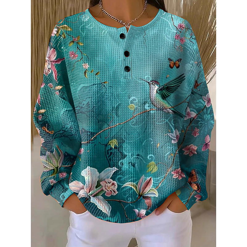 Women's Pullover Sweatshirt Floral Graphic Vintage Casual Long Sleeve Crew Neck Regular Tops Casual Street Dailywear Buttons Print Blue Yellow Pink Purple Spring Fall Winter