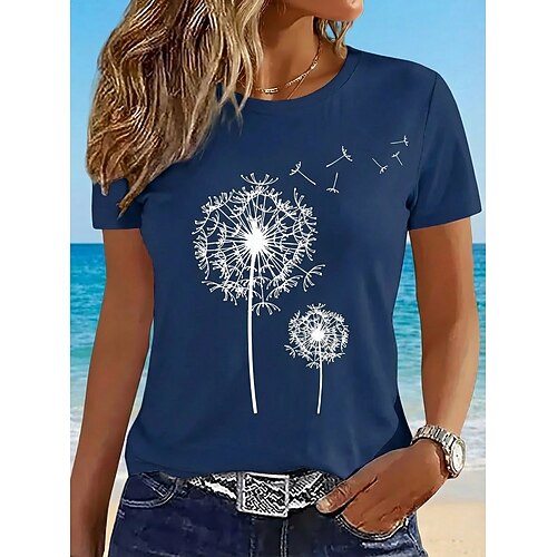 t-shirt casual da donna con stampa di tarassaco girocollo bianca manica corta abbigliamento estivo vestibilità comoda essenziale per tutti i giorni