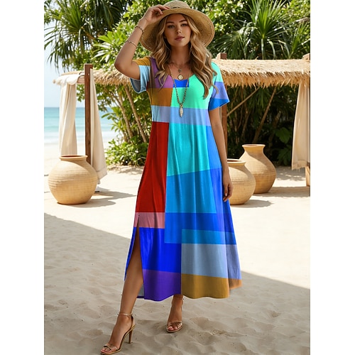 Per donna Abito lungo maxi Misto cotone Abito a Tubino Vestito Casual Abito in cotone Moda Moderno Quotidiano Weekend Vestibilità comoda Semplice Manica Corta Scollo a V Blu Rosso Cammello Viola
