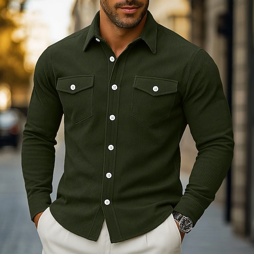 Per uomo Camicia di Velluto a Coste Kaki Verde militare Beige Grigio Manica Lunga Semplice Colletto Collo ripiegato Casuale All'aperto Tasca Abbigliamento Vintage Classico Casual Abbigliamento da