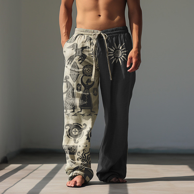 Men's Graphic Prints Linen Pants Baggy Pants Mid Waist Ethnic Style Casual Drawstring Elastic Waist Front Pocket Spring Summer Black Blue Khaki