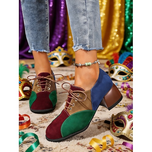 scarpe oxford con tacco a blocco e patchwork multicolore da donna – décolleté con lacci color block retrò per costumi di carnevale, clown e abbigliamento quotidiano alla moda