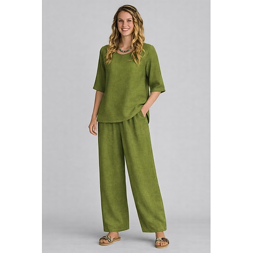 completi da donna in cotone e lino, completi da casa comodi e alla moda, tinta unita, arancione, rosso, blu navy, nero, bianco, verde scuro, primavera autunno