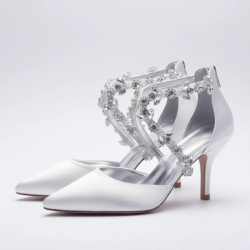 White Pointed Toe Crystal Strap Bridal Heels – Elegant Wedding Shoes for Glam or Classic Weddings