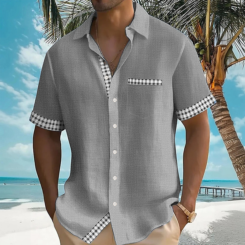 Men's Geometric Grid / Plaid Shirt Summer Shirt Button Up Shirt Short Sleeve Fashion Casual Vacation Holiday Streetwear Summer Turndown 3D Print Front One Pocket Linen Like Shirt Yellow Blue Green