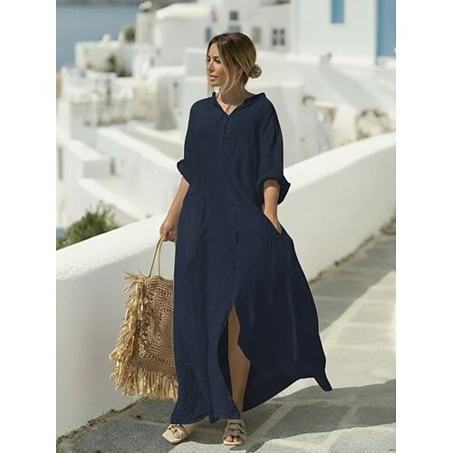 Per donna Abito maxi Finto cotone e lino Abito in cotone e lino Moda Moderno Quotidiano All'aperto Vacanza Vestibilità comoda Semplice Manica Lunga Scollo a V Nero Bianco Giallo Blu marino Estate
