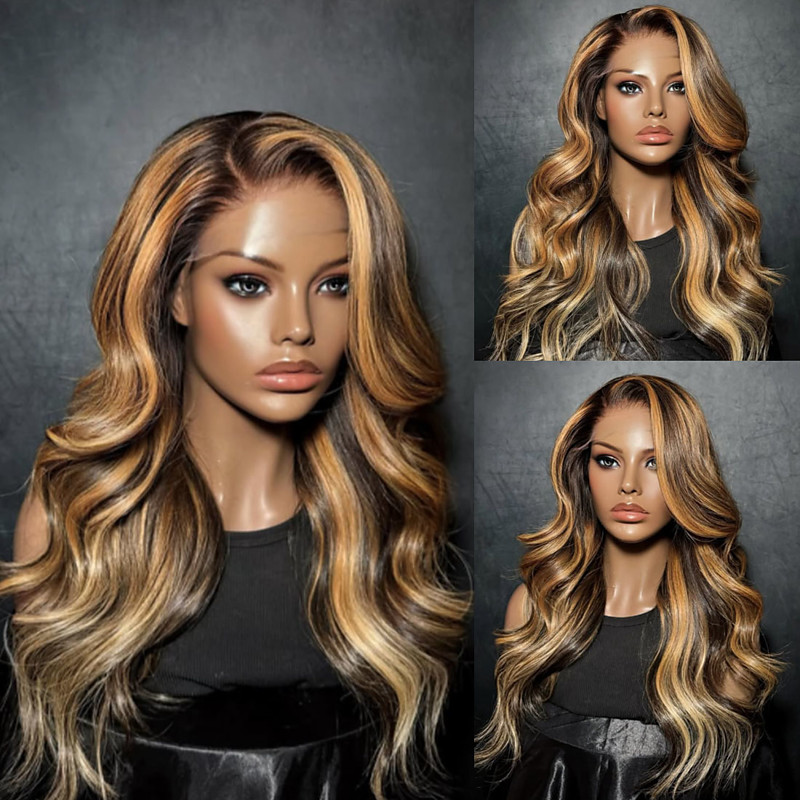 Brasilianische Remy-Echthaarperücke, 5x5 Closure, 13x4 Lace Front, honigblond gesträhnt, Body Wave, blond-braune Perücke mit Babyhaaren, kleberlos, vorgezupft