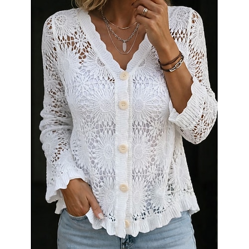 Per donna Camicia di Pizzo Blusa Pizzo Bottoni Tinta unica Elegante Casual Manica Lunga Scollo a V Top Regolari Quotidiano Nero Bianco Beige Estate Primavera Autunno