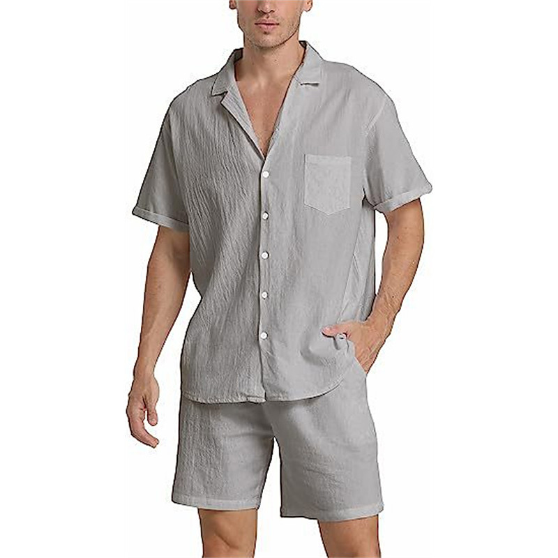 Men's 2 Piece Shirt Set Matching Sets Casual Shirt Button Up Shirt Black White Royal Blue Blue khaki Short Sleeve Plain Band Collar Vacation Street Clothing Apparel Fashion Casual