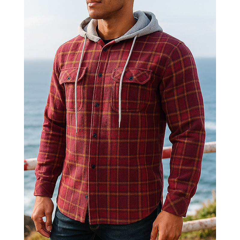 Men's Shacket Shirt Jacket Winter Jacket Plaid Vacation Daily Wear White Red Blue Orange Long Sleeve Hooded Fall Winter Clothing Apparel Front Pocket