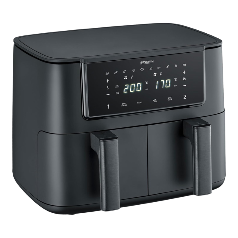 Severin Dual-Zonen-Heißluftfritteuse, 2 x 4 L Fächer, vielseitige Zubereitungsmethoden, Touchdisplay, Warmhaltefunktion, Temperatur einstellbar und synchronisierbar, 10 Programme, 2600 W, Schwarze Linie, FR 2463