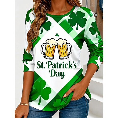 St. Patricks Day Damen T Shirt Grafik Kleeblatt Bier Mode Stilvoll Lässig Langarm Rundhalsausschnitt Normale Oberteile Täglich Wochenende Urlaubskleidung Druck Grün Sommer Frühling Herbst