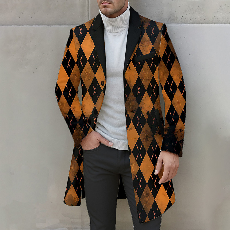 Men's Geometric Argyle Overcoat Coat Casual Business Daily 3D Print Buttons Front Pocket Spring Fall Winter Notch Long Sleeve Yellow Orange Brown