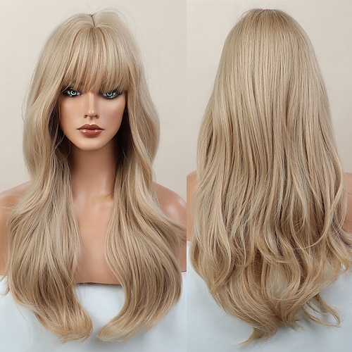 Blonde Perücken mit Pony, blonde, gewellte Perücken für Frauen, weiches, natürliches, hellblondes Haar, Perücke mit Pony, hitzebeständige Faser, synthetische Haarperücke, Weihnachtsparty-Perücken,