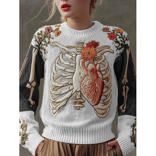 Maglione da Donna Carino Streetwear Casual Grafica Scheletro Collo Giro Patchwork Maglione Maniche Lunghe Tops Regular Knit Bianco Blu Autunno Inverno