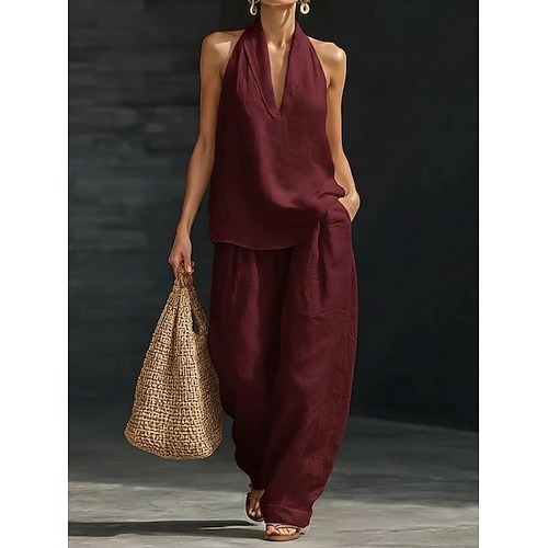 Per donna Camicia Set da due pezzi Finto cotone e lino Pantaloni di Lino Pantaloni Set Manica Lunga Colletto a Camicia Tinta unica Coulisse Moda Streetwear Abbigliamento quotidiano Data Bianco Verde