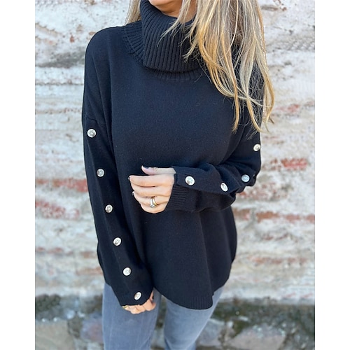 Per donna Felpa Moda Streetwear Casual Colore Puro A Coste Dolcevita Bottoni Lavorato a maglia Manica Lunga Top Regolari Maglia All'aperto Quotidiano Weekend Nero Autunno Inverno