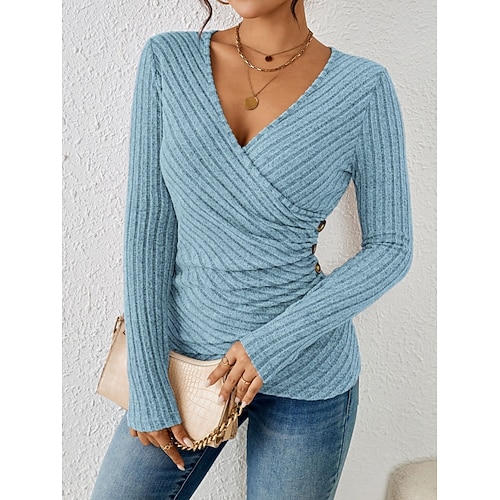 Per donna Blusa Tinta unica Elegante Essenziale Casual Manica Lunga Scollo a V Top Regolari Quotidiano Bottoni Nero Marrone Albicocca Azzurro Primavera Autunno