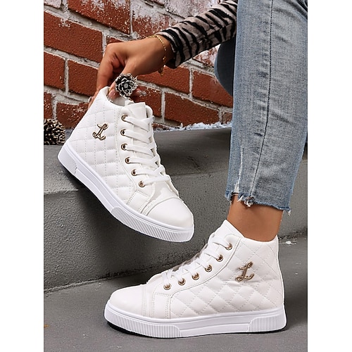 sneakers alte trapuntate bianche da donna, scarpe con plateau stringate alla moda con dettagli dorati, calzature casual eleganti per l'uso quotidiano e le uscite