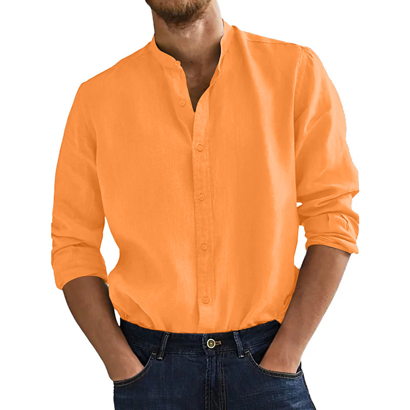 Men's Shirt Band Collar Shirt Summer Shirt Beach Wear Casual Shirt Button Up Shirt Solid Color Vacation Curise Black White Pink Orange Long Sleeve Collar Clothing Apparel