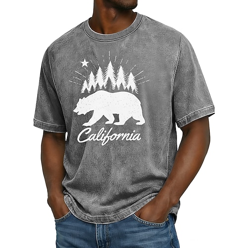 T-shirt da uomo con stampa grafica, motivo: orso grizzly della California, pini, foresta, stella, vintage, retrò, all'aperto, natura, lavaggio acido, manica corta, vestibilità standard, casual,