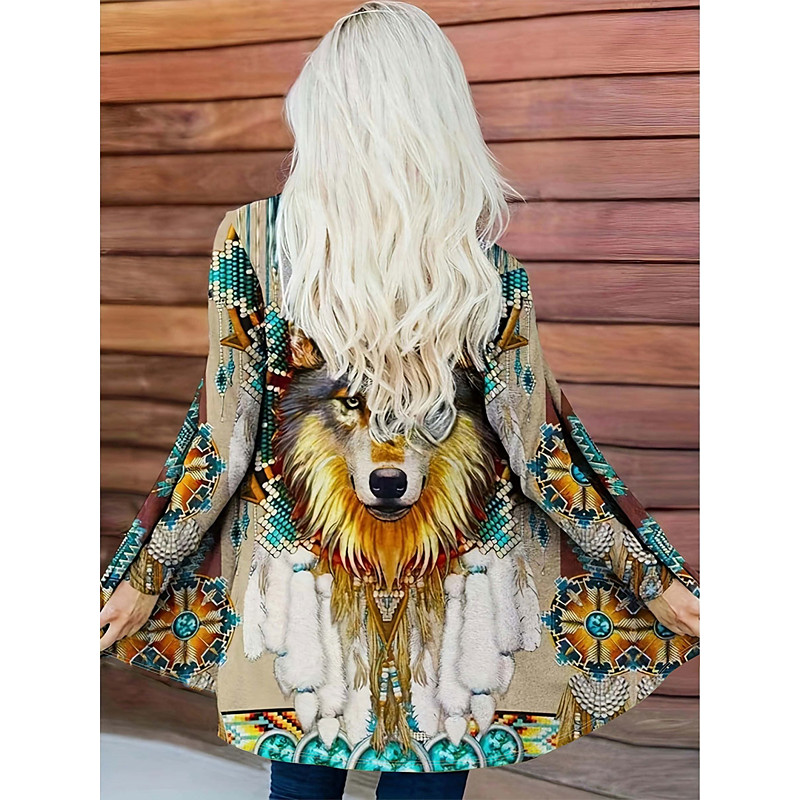 Women's Winter Coat Trench Coat Lightweight Comfortable Print Open Front Vintage Fashion Casual Boho Vintage Animal Vacation Casual Regular Collarless Loose Fit Long Sleeve Outerwear Green Khaki