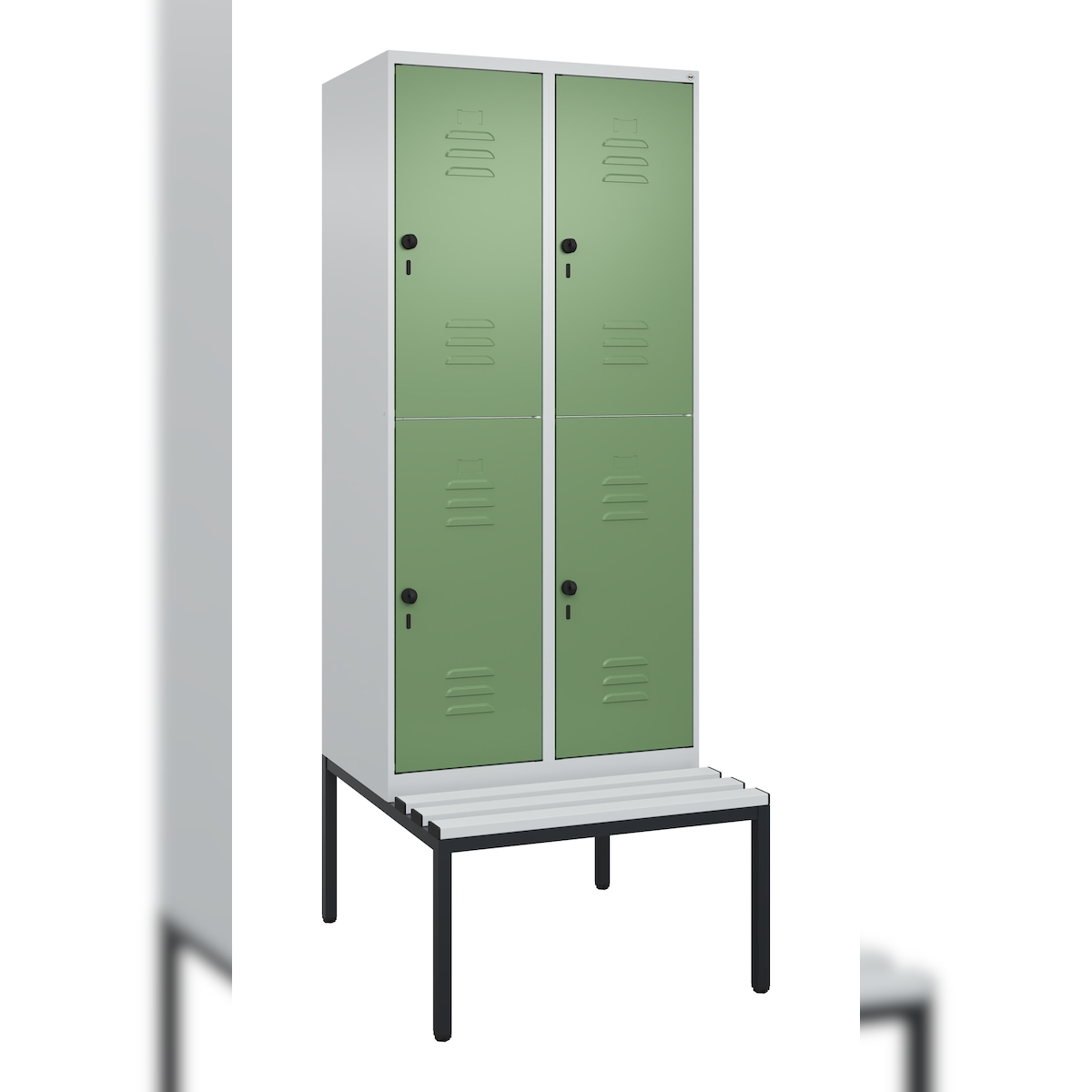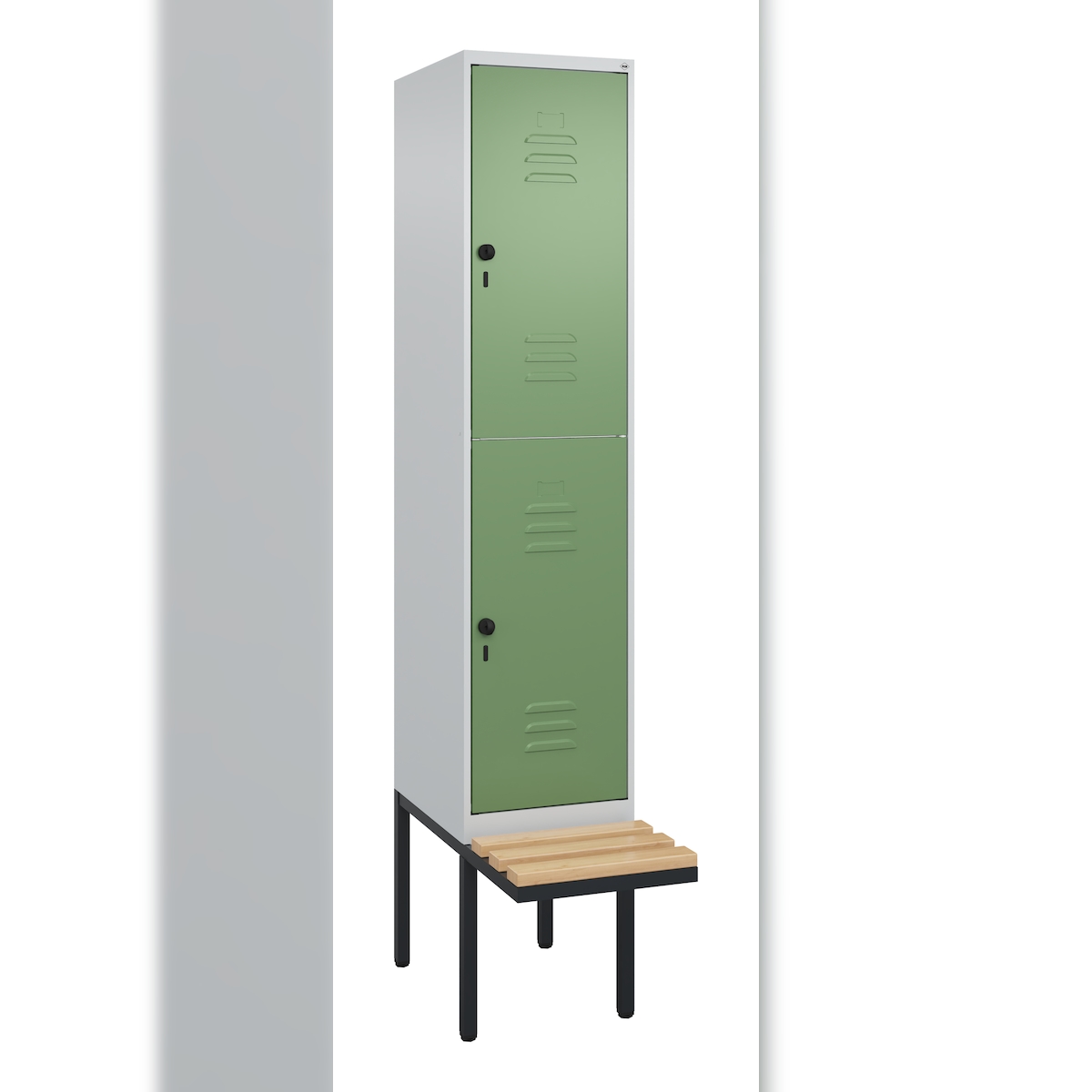 C+P Spind Classic PLUS, schwebender Sitzbank aus Buche 2 Abteile, HxBxT 212x60x82cm, Sicherheitsdrehriegel, Hellgrau/Resedagrün von PROREGAL