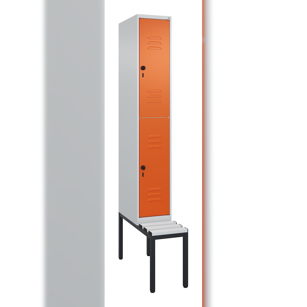 C+P Spind Classic PLUS, Kunststoff untergebaute Sitzbank, 2 Abteile, HxBxT 212x30x82cm, Sicherheitsdrehriegel, Hellgrau/Reinorange von PROREGAL