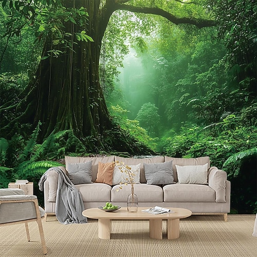 Arazzo da parete con tema foresta naturale, raggi di sole che filtrano tra gli alberi, paesaggio da appendere al muro, bosco nebbioso, pineta muschiosa, grande poster in tessuto per camera da letto,