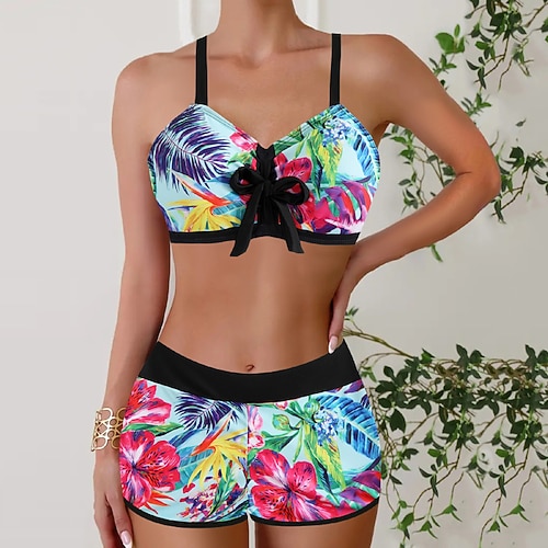 Costume da bagno due pezzi tankini da donna con pantaloni corti palmo controllo della pancia vita alta slanciato senza schienale abbigliamento da spiaggia per le vacanze colore solido floreale collo