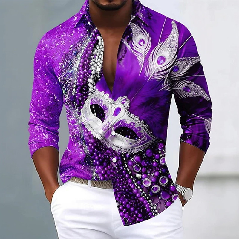 Mardi Gras Men's Carnival Beads Mask with Feathers Shirt Button Up Shirt Long Sleeve Fashion Casual Party Holiday Spring Fall Turndown 3D Print Collared Shirts Blue Purple Green