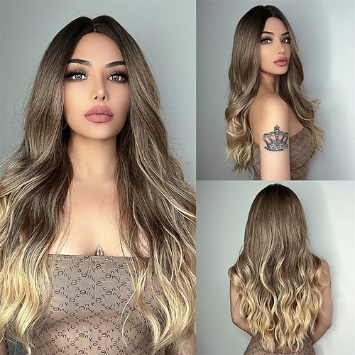 Lange Perücken für Frauen Mittelscheitel Wellig Perücke - Natürlich Aussehende Synthetische Hitzebeständige Faserperücke Für Veranstaltungsfeiern Cosplay Täglich 26IN(Ombre Blonde) Halloween Perücken